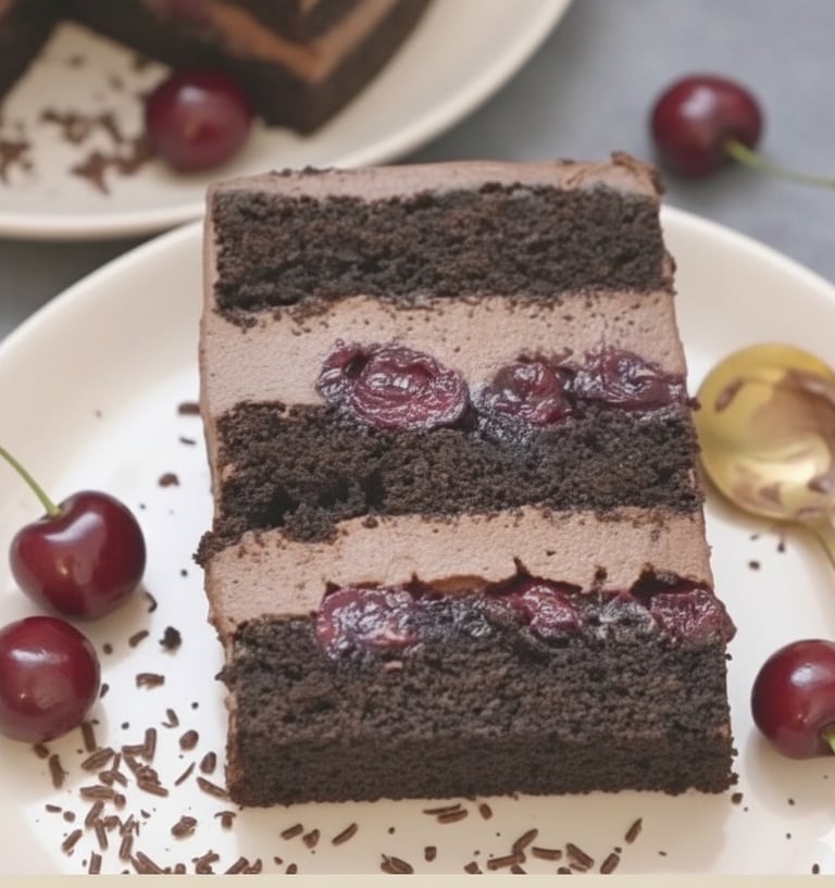 Ciasto czekoladowe z wiśniami, przełożone czekoladowym ganachem i delikatnym kremem wiśniowym